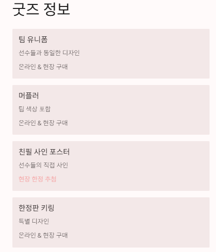 | 머플러 | 팀 색상 포함, 목에 두르고 경기 응원 가능 | 온라인, 현장 |