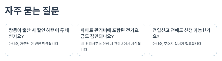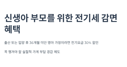 | 제도 개요 | 신생아 전기세 감면 제도는 출산이나 입양 가정이 최대 3년 동안 받을 수 있는 지원책입니다. |