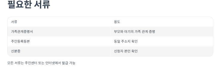 | 주민등록등본 | 집에 누가 살고 있는지, 주소지를 확인 | 부모와 아기의 주소지가 동일함을 증명 |