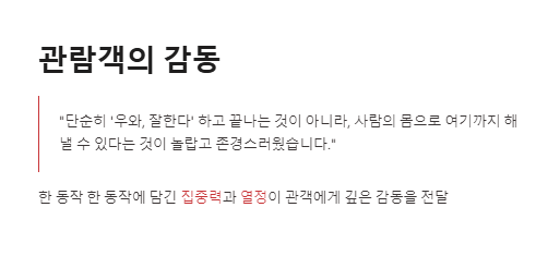 | 감동 | 마지막에는 공연을 통해 메시지와 감동을 함께 받음 | 단순 엔터테인먼트를 넘어선 예술적 경험 |
