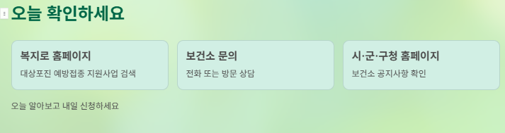 이런 이유로 동네마다 있는 시청이나 구청, 보건소 같은 곳에서는 “예방주사 비용이 비싸니까 우리가 도와드리겠습니다” 하고 지원 제도를 운영하고 있습니다. 이런 도움을 받으면 돈 걱정은 줄이고 건강은 지킬 수 있는 것입니다.