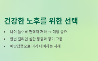 특히 나이가 들면 우리 몸의 면역력이 약해집니다. 면역력이 약해지면 병에 걸리기 쉬워집니다. 그래서 예방주사를 맞으면 나이가 들어서도 더 건강하게 지낼 수 있습니다. 건강은 나이가 들수록 가장 소중한 자산이 되는 것입니다.